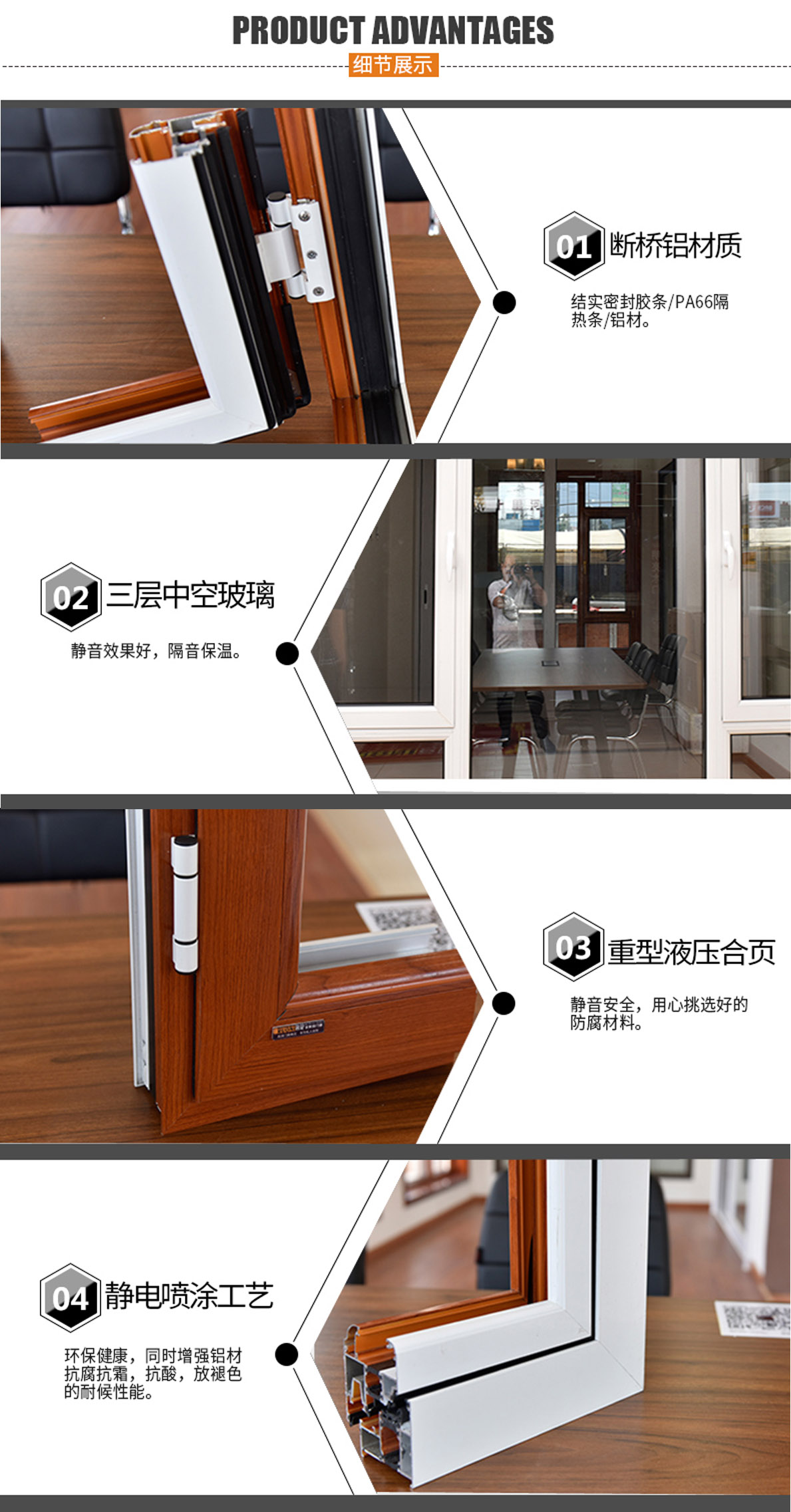 1、門的整體結(jié)構(gòu)采用加厚,加寬,帶龍骨的鈦美鋁合金,不僅增加了門的隔音效果,而且大大加強(qiáng)門的牢固性和耐用性。
